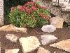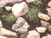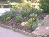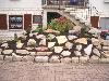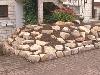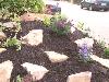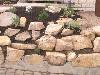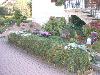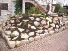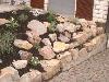 Vorgarten Umgestaltung: Vorhandener Bewuchs wurde gerodet, alte Mauersteine entfernt, Abfangung durch Bruchsteine, Fläche wurde mit Stauden und Gräsern bepflanzt und mit Rindenhumus abgedeckt.