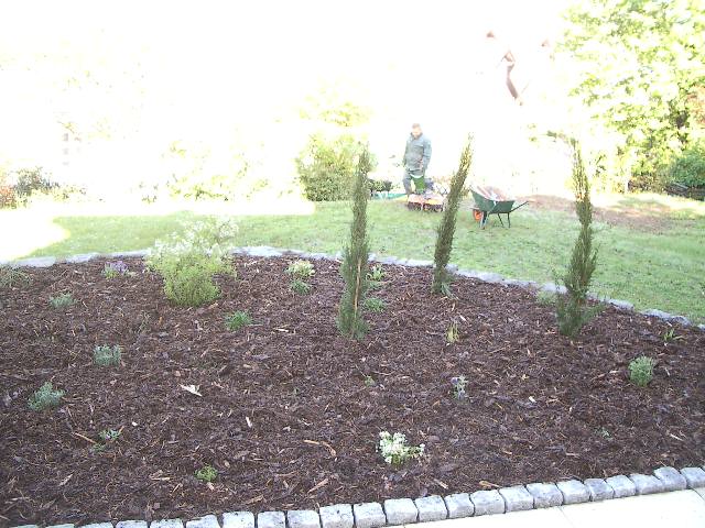 frisch bepflanztes Beet mit Rosen, Stauden,Kleingehölzen und Säulenzypressen