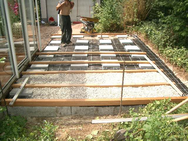 Unterbau Erstellung aus Bankiraikannthölzern, Wurzelschutzfolie wurde ausgelegt und mit Kieselsteinen bedeckt.